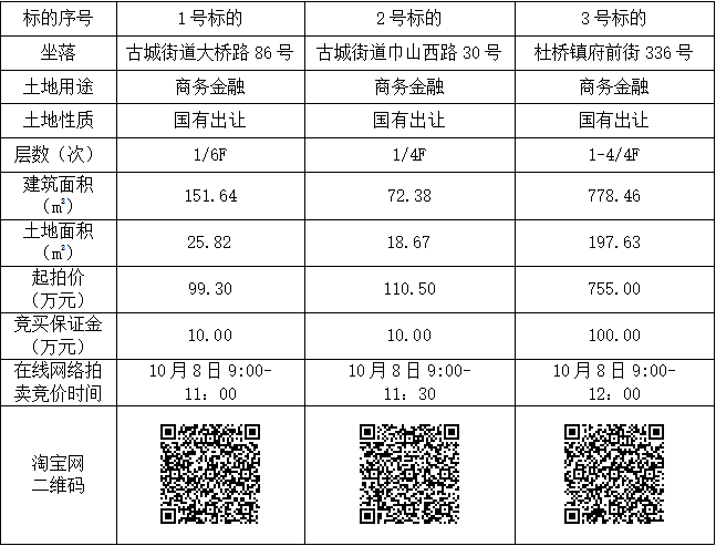 受浙江临海农村商业银行股份有限公司的委托,定于2022年10月8日(每个标的竞价的具体起止时间详见下表,延时的除外)在“淘宝网”阿里资产拍卖网络平台上(网址:https://zc-paimai.taobao.com,户名:台州市城乡拍卖有限公司)对下列三处处置房产进行公开挂牌拍卖,现公告如下: